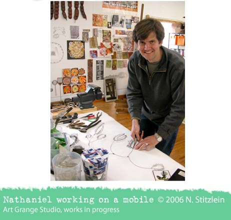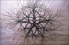 Nathaniel's 3-dimensional creations can be hung from the ceiling, casting beautiful shadows on the surrounding walls and floor. The mixed media pieces with glass shards create dancing rays of color when hung near a window or another light source. Some sculptures are flat and meant to be hung directly on the wall. He has recently begun creating wire mobiles inspired by the wide diversity of seed pods. Special orders/commissions are accepted. He can create wire portraits based on photos of your favorite people and/or pets! Michelle has a very busy schedule of exhibitions, lectures and workshops.